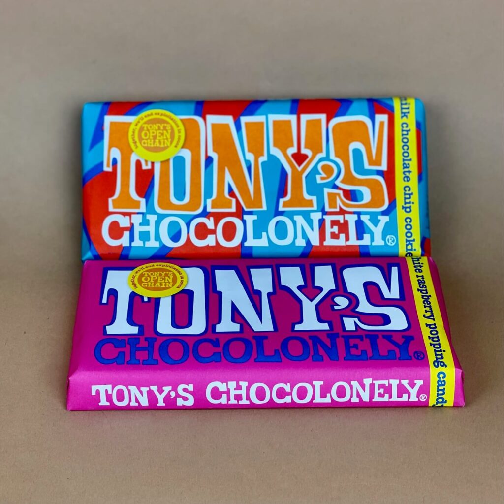 Tony's Chocolonely 180g Bar White Choc Raspberry Popping Candy or Milk Chocolate Chip Cookie