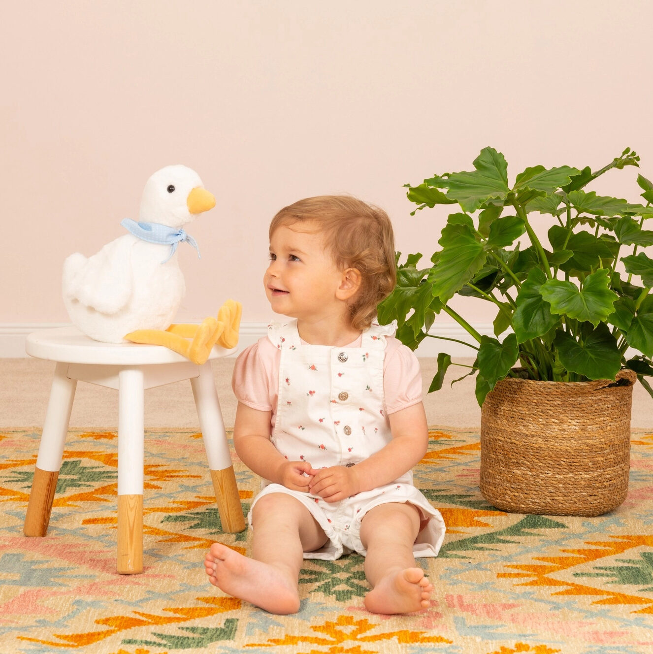 Our super cute Elisa Duck soft toy is ready for cuddles. With her white plush, golden beak and feet she is looking very fashionable wearing her blue and white polka dot scarf!  Elisa Duck comes with your personal message on the medal around her neck and you can choose to add a gift box with ribbon or a red drawstring bag and even pop in some chocolate too! Select your choices below.