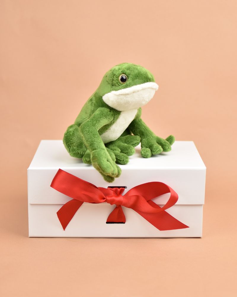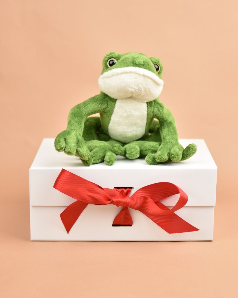 This cuddly sitting frog comes with your personalised message medal as standard, with the choice of adding a luxury gift box with choice of ribbons or red drawstring bag and some yummy chocolate.