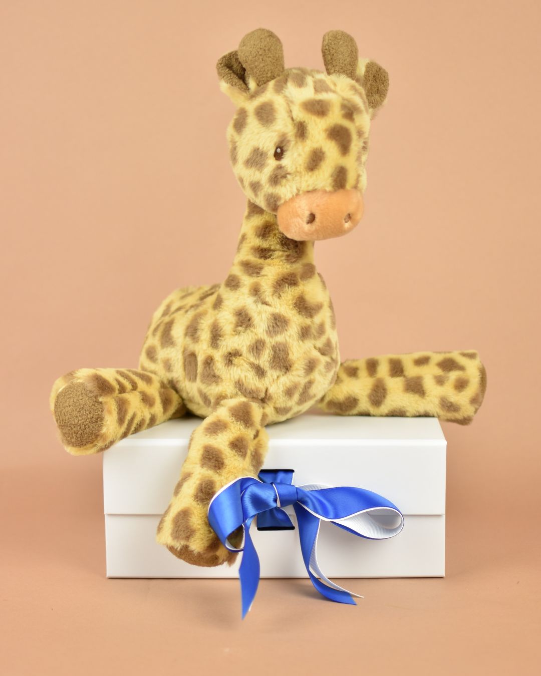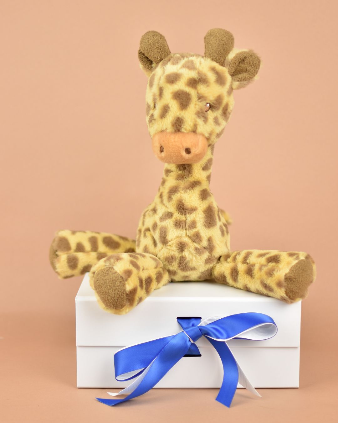 This gorgeous cuddly toy giraffe comes with your personalised message medal as standard, with the choice of adding a luxury gift box with choice of ribbons or red drawstring bag and some yummy chocolate.