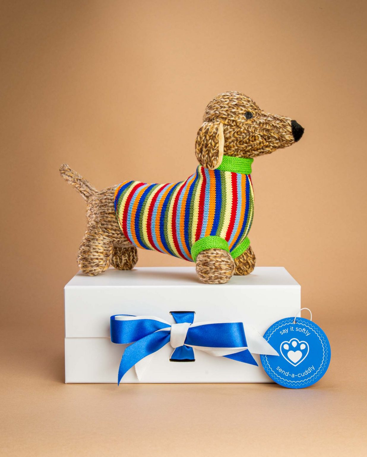 We are sure you’ll agree that our Knitted Dachshund soft toy is a perfect companion for all ages and makes an ideal gift for all occasions. Often referred to as a ‘Sausage dog’, due to its short legged and long bodied features, the crochet Sausage Dog has a very unique shape and is instantly recognisable. Our Knitted Sausage dog is Fairtrade, handmade, and very adorable!