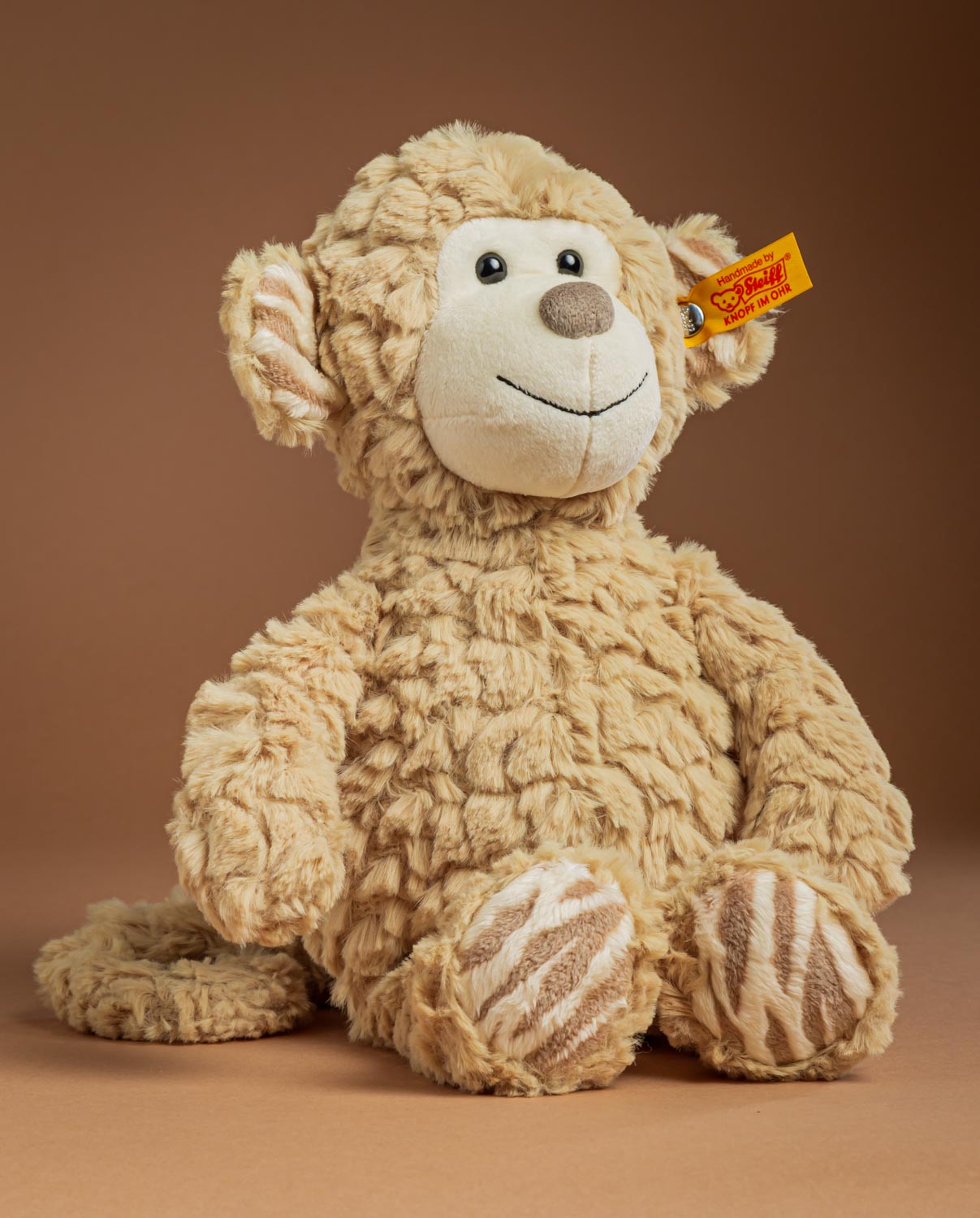 Our Steiff Bingo Monkey has soft beige fur, cute little ears and a very sweet smile. Our Steiff Bingo Monkey is 30cm tall and comes with a personalised message medal of your choice. You could also add one of our luxury gift boxes to make it extra special! Suitable from birth but loved by everyone, Bingo Monkey makes a cuddly companion.